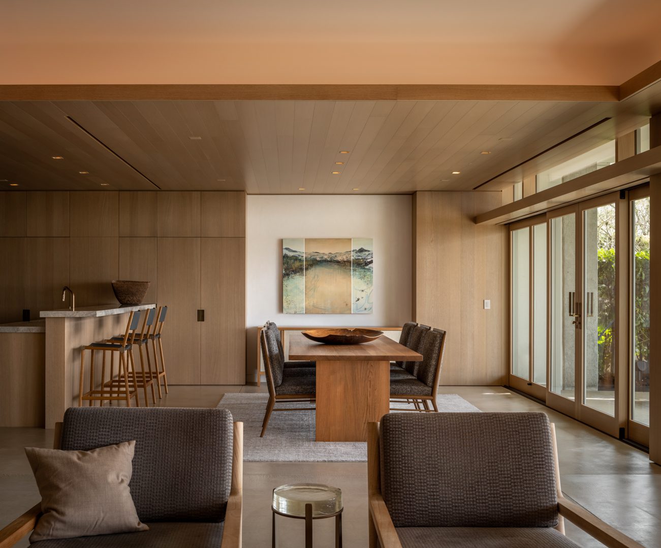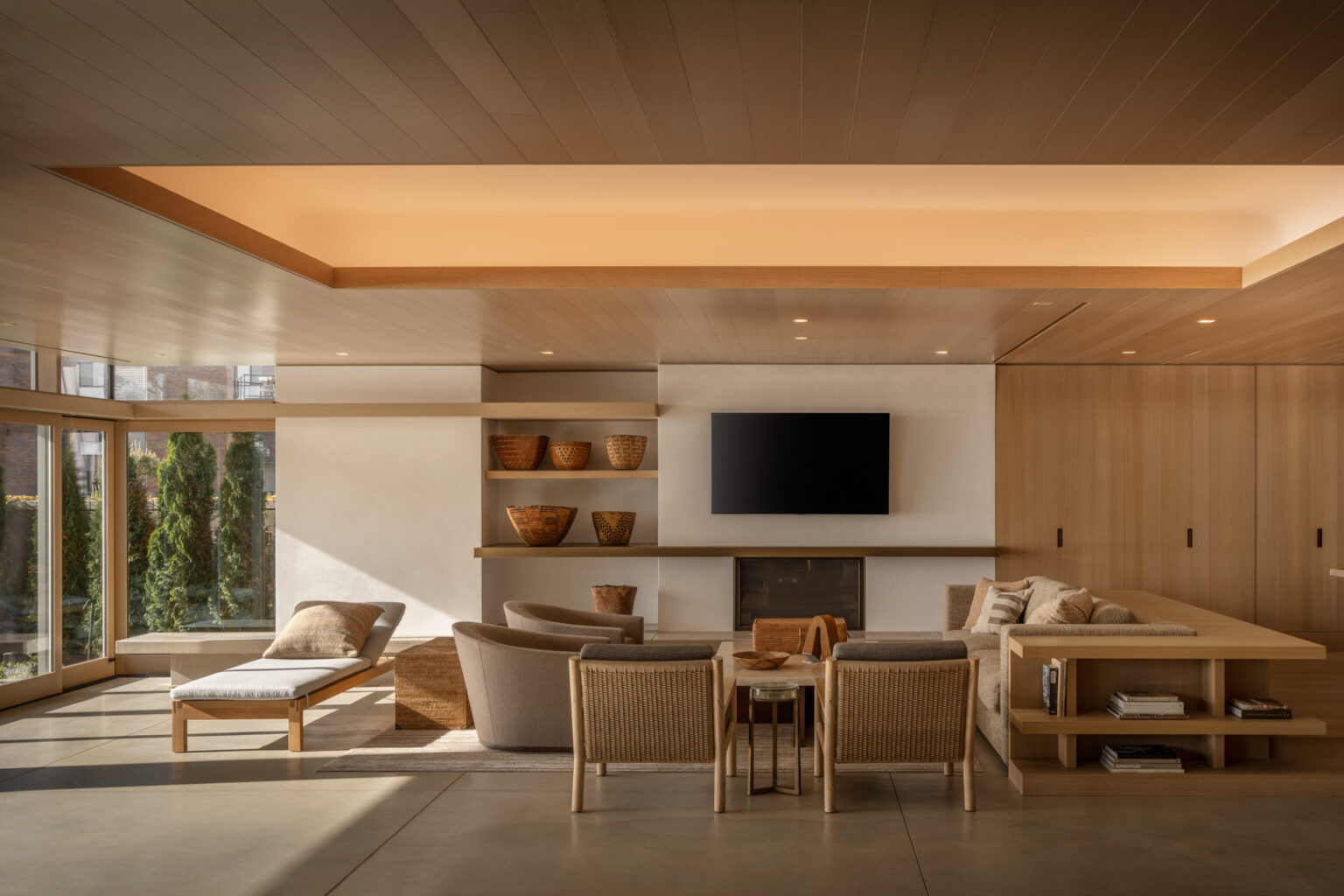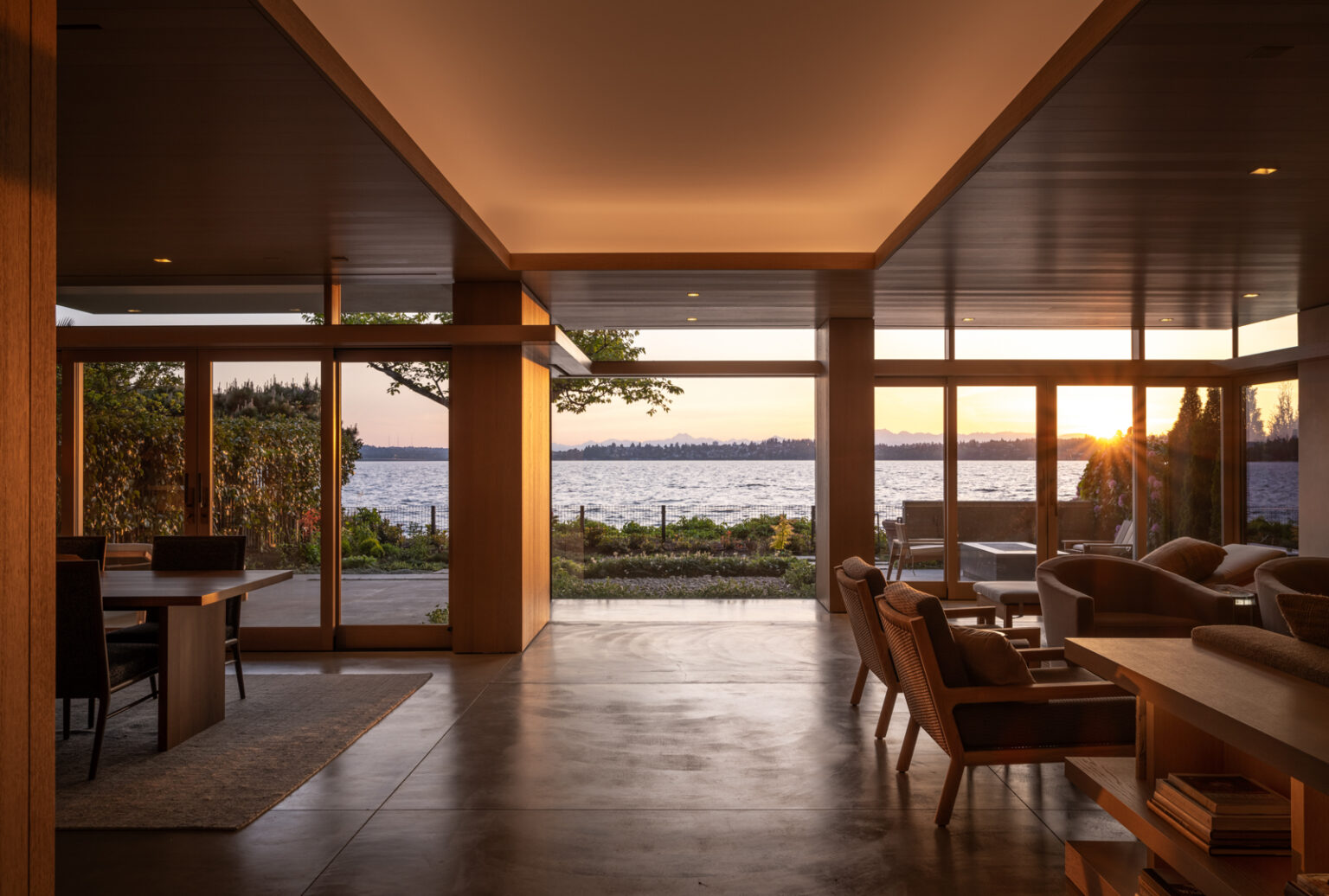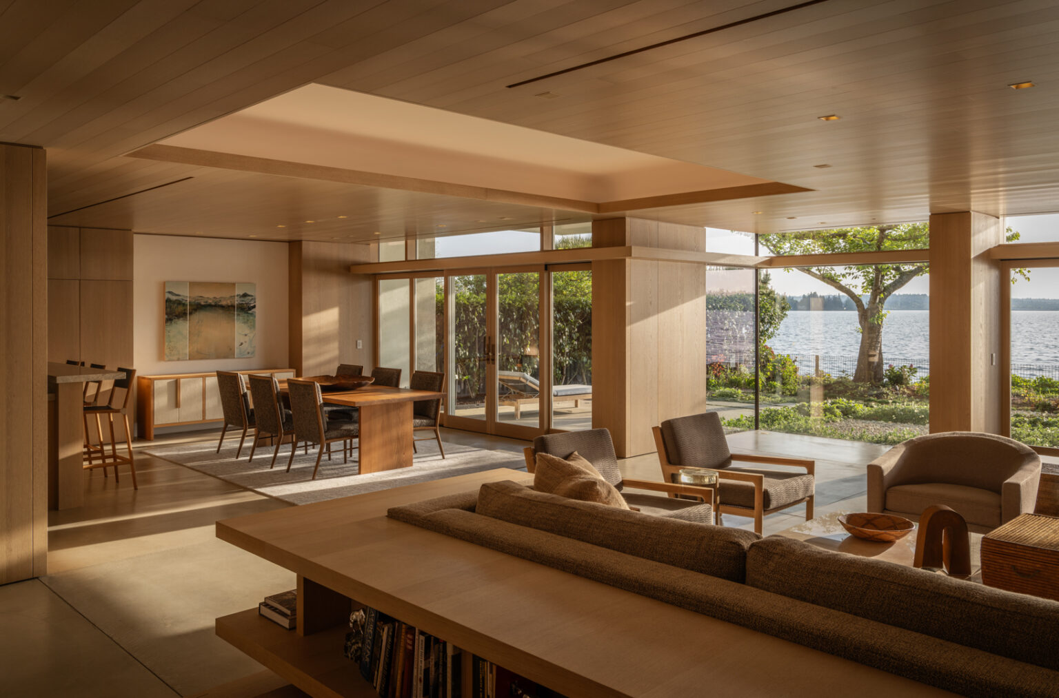 The interior palette – white oak panels and casework, warm-toned plaster walls, and lightly troweled concrete floors – echoes the natural tones of the Pacific Northwest while remaining neutral enough to serve as a backdrop for the dynamic play of light, water, and clouds outside.