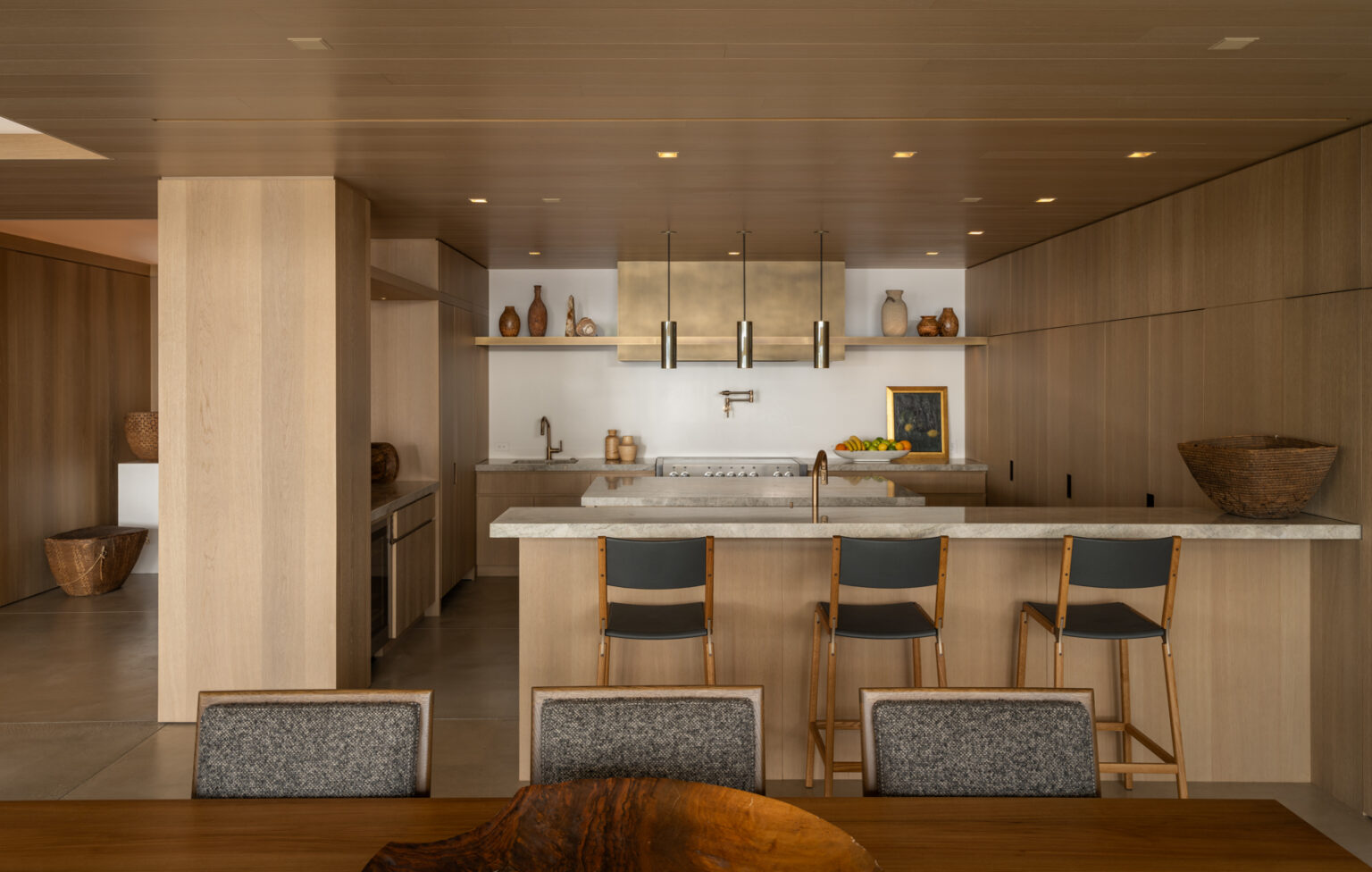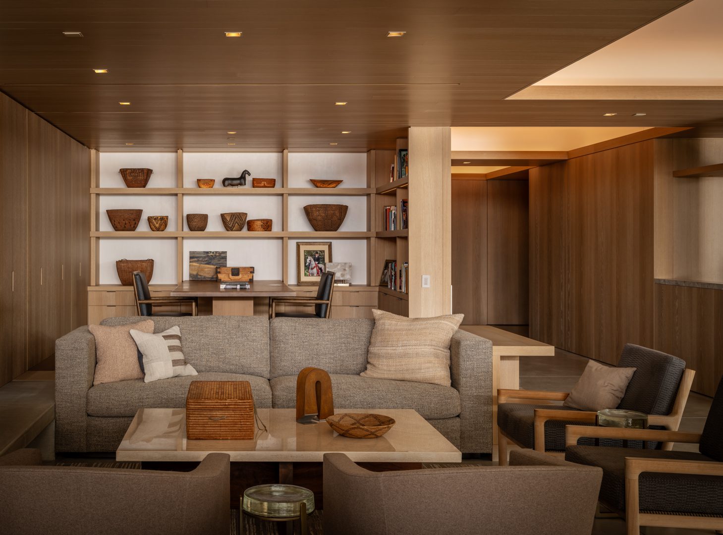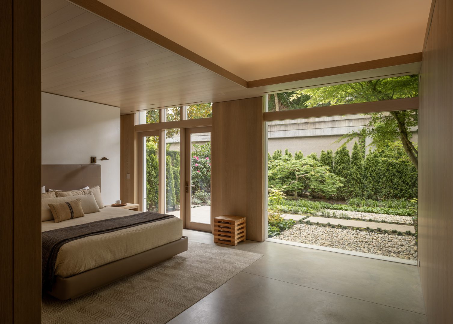 The interior palette – white oak panels and casework, warm-toned plaster walls, and lightly troweled concrete floors – echoes the natural tones of the Pacific Northwest while remaining neutral enough to serve as a backdrop for the dynamic play of light, water, and clouds outside.