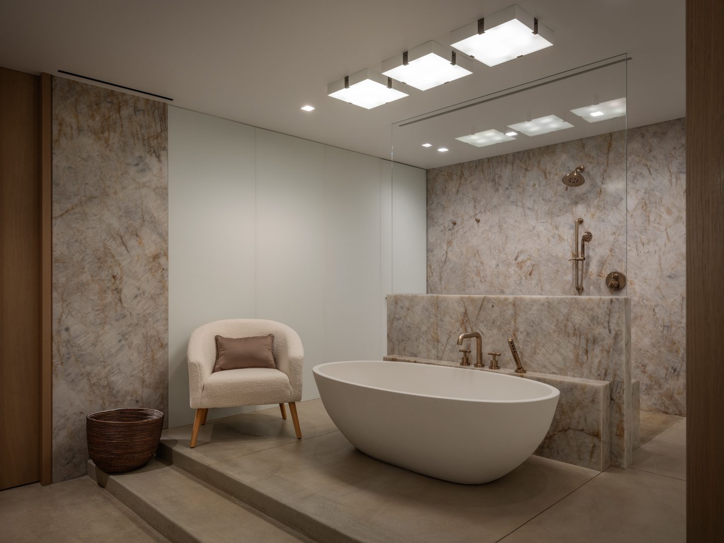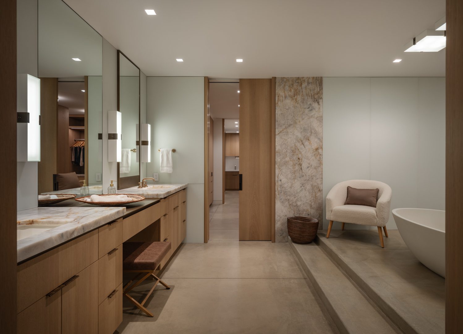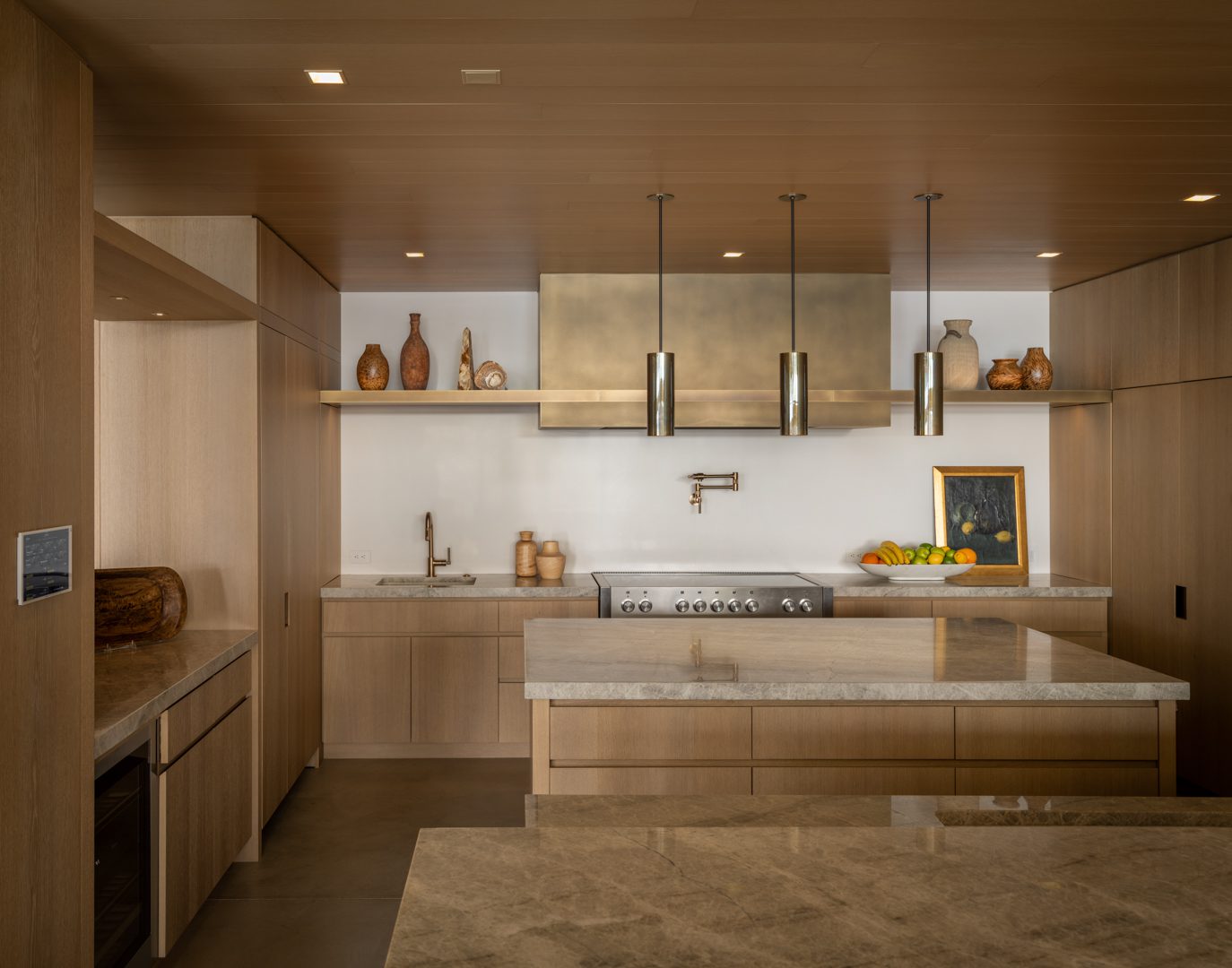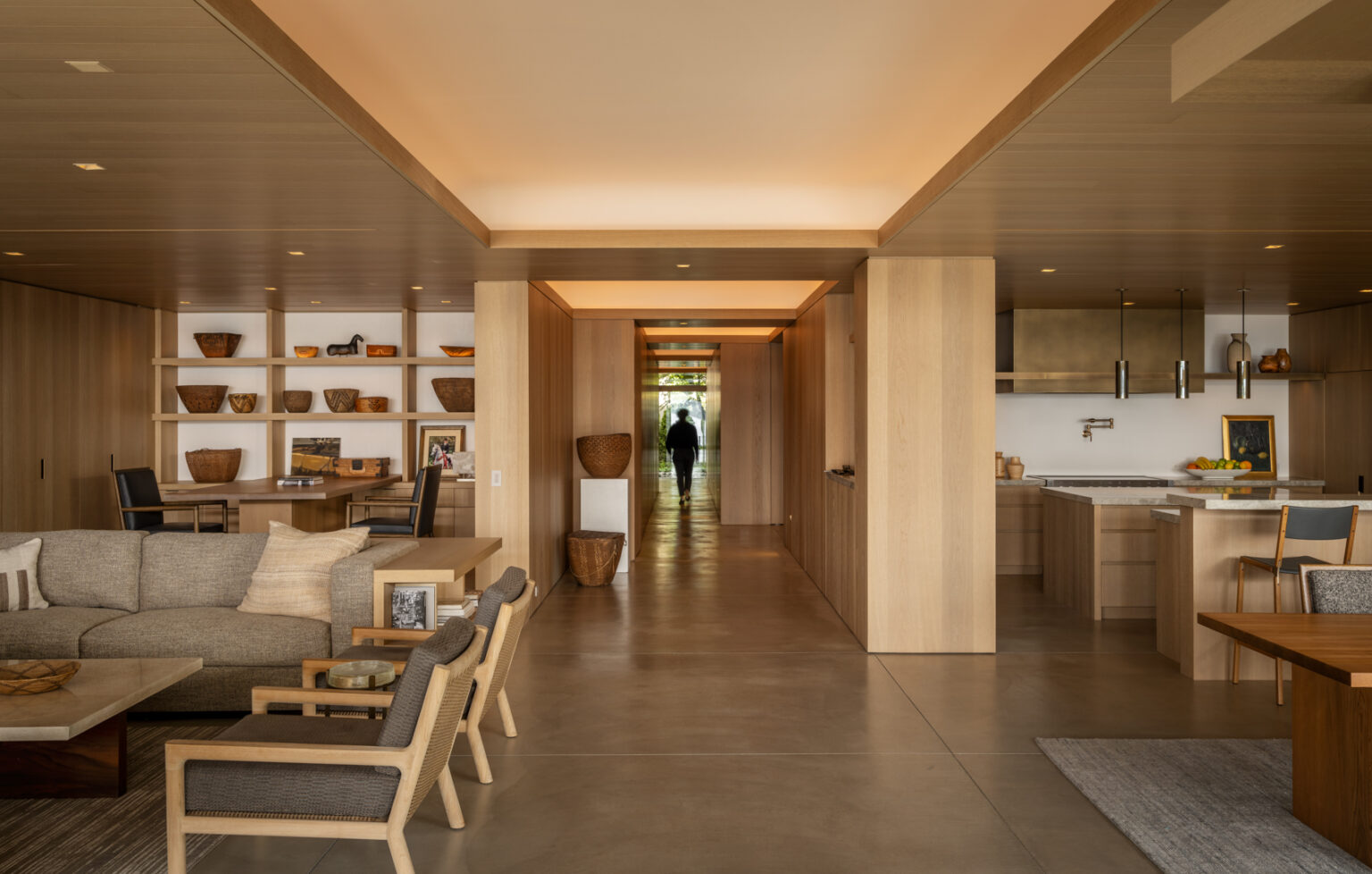 The interior palette – white oak panels and casework, warm-toned plaster walls, and lightly troweled concrete floors – echoes the natural tones of the Pacific Northwest while remaining neutral enough to serve as a backdrop for the dynamic play of light, water, and clouds outside.